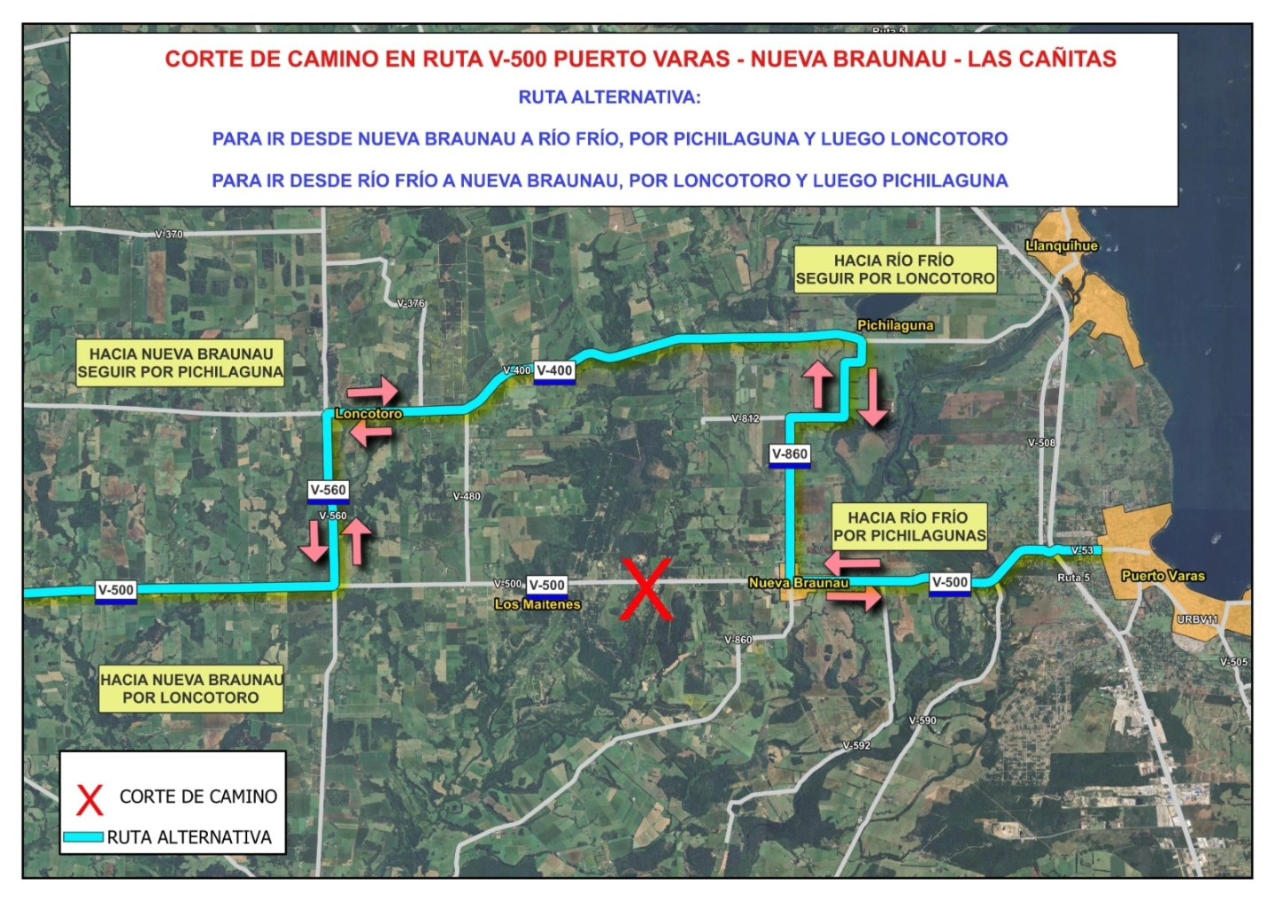 El Ministerio de Obras Públicas en Los Lagos da cuenta de interrupción de tránsito en Ruta V–500 Puerto Varas – Nueva Braunau – Las Cañitas sector Puente Colegual, debido a trabajos por daños estructurales e instalación de puente mecano bidireccional. Esto, programado hasta el viernes 17 de octubre.